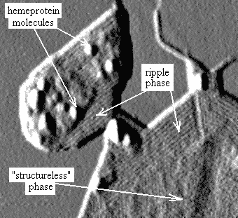 Fig. 4. In liquid crystalline so-called "ripple" phase molecules of lipid are arranged in cylinders with parallel orientation (bands on the image). Individual protein molecules (cytochrome P-450 scc) are clearly distinguishable as well. |